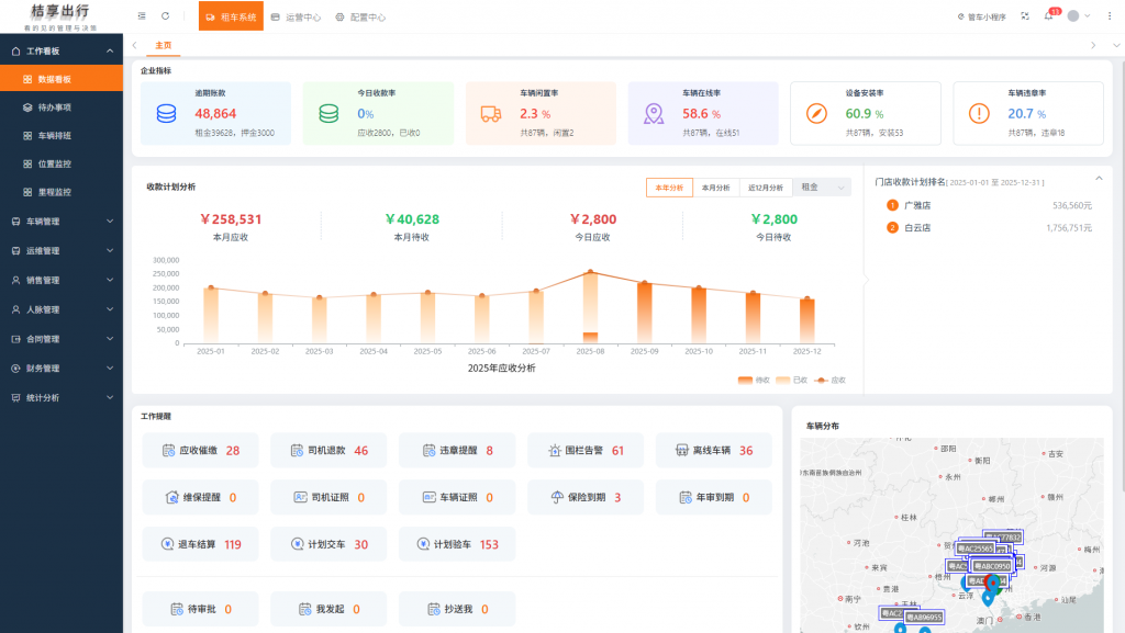 - 运营报表:车辆利用率、出租率、平均租期、客户复购率分析。