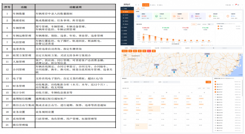 - 自动计费与结算:根据合同自动生成账单,支持租金、超里程费、违章违约金、加油服务费等各类费用计算。